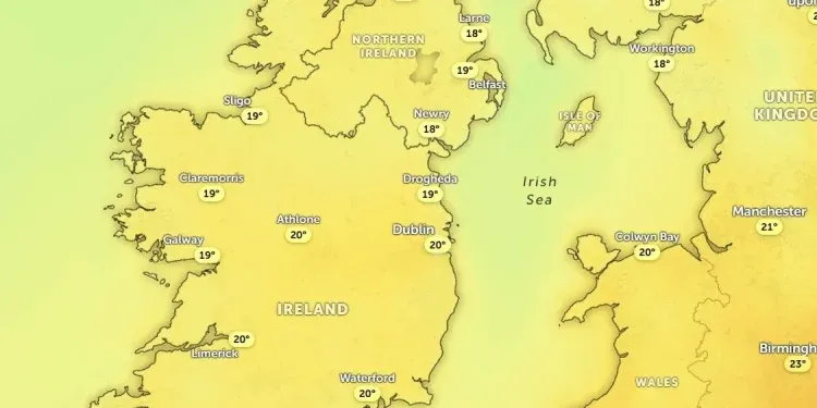 Tomorrow (Tuesday) is set to continue the warm trend, with highs of 20–23°C. Met Éireann forecasts another mainly dry day, with bright sunshine in the morning giving way to scattered showers later. Overnight, temperatures will stay in the mid-teens as cloud builds from the southwest, potentially bringing outbreaks of rain by dawn.