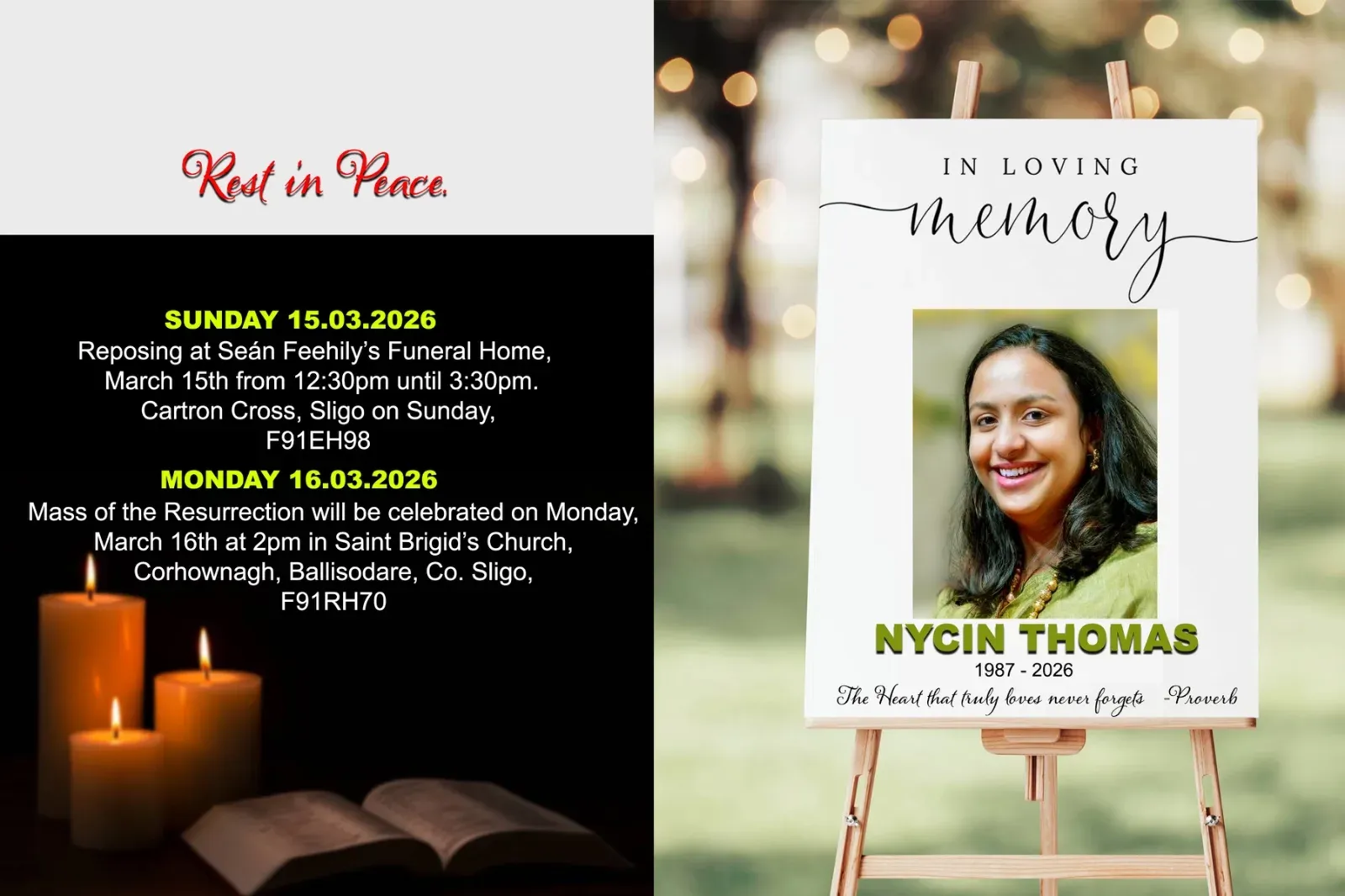 Sligo: Nycin Thomas (38), a Dialysis Nurse at Sligo University Hospital, has passed away. The funeral will be held on Monday, March 16th, at 2:00 PM at Saint Brigid’s Church, Corhownagh, Ballisodare, Co. Sligo (F91RH70).